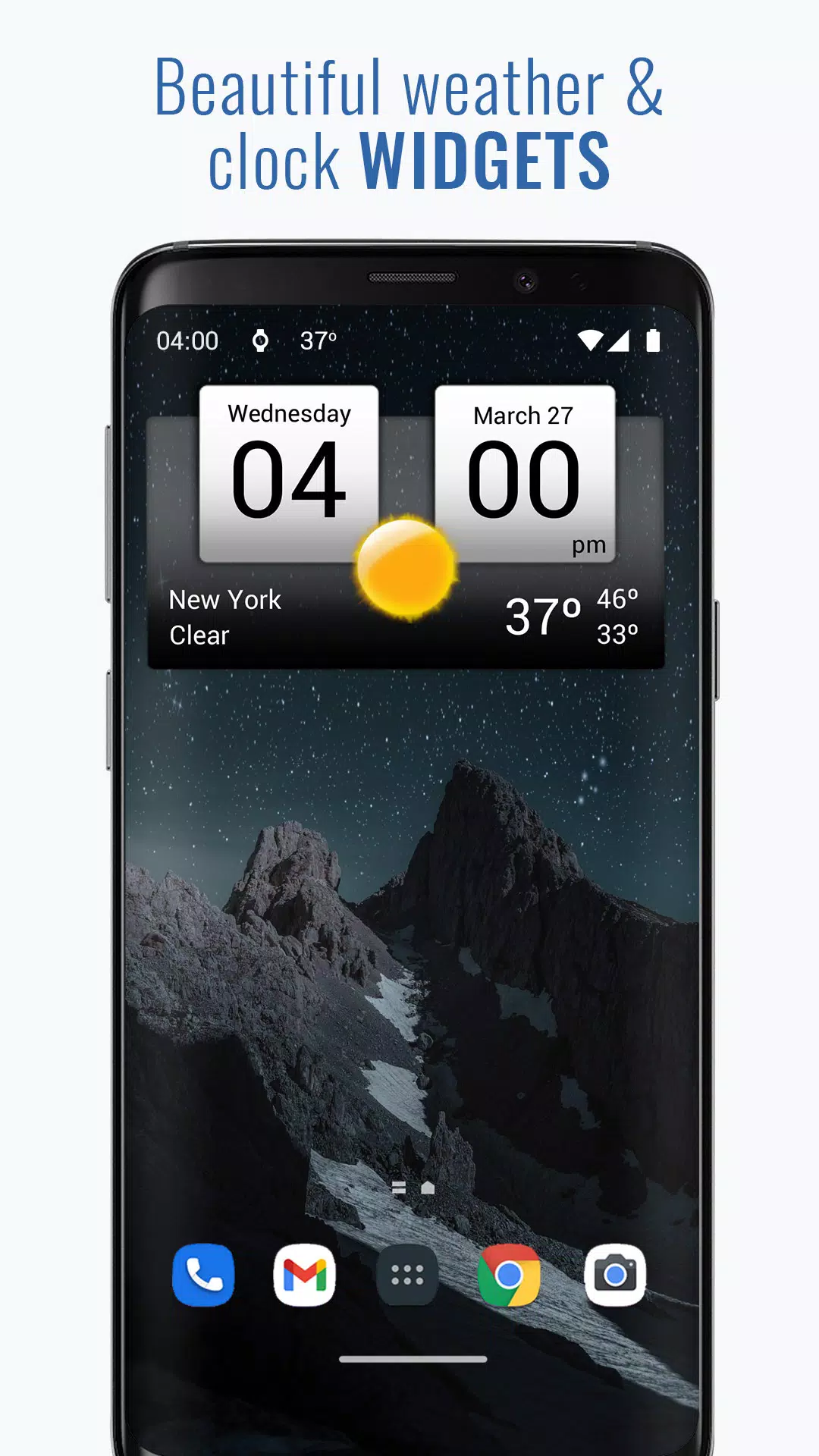 Our 4x2 widget is not just visually appealing but also highly functional. It displays current weather conditions with icons, temperature, and even the time and date, along with your next alarm. The widget also features hotspots, allowing you to quickly launch your favorite apps. Additionally, you can expand your options with downloadable widget skins.