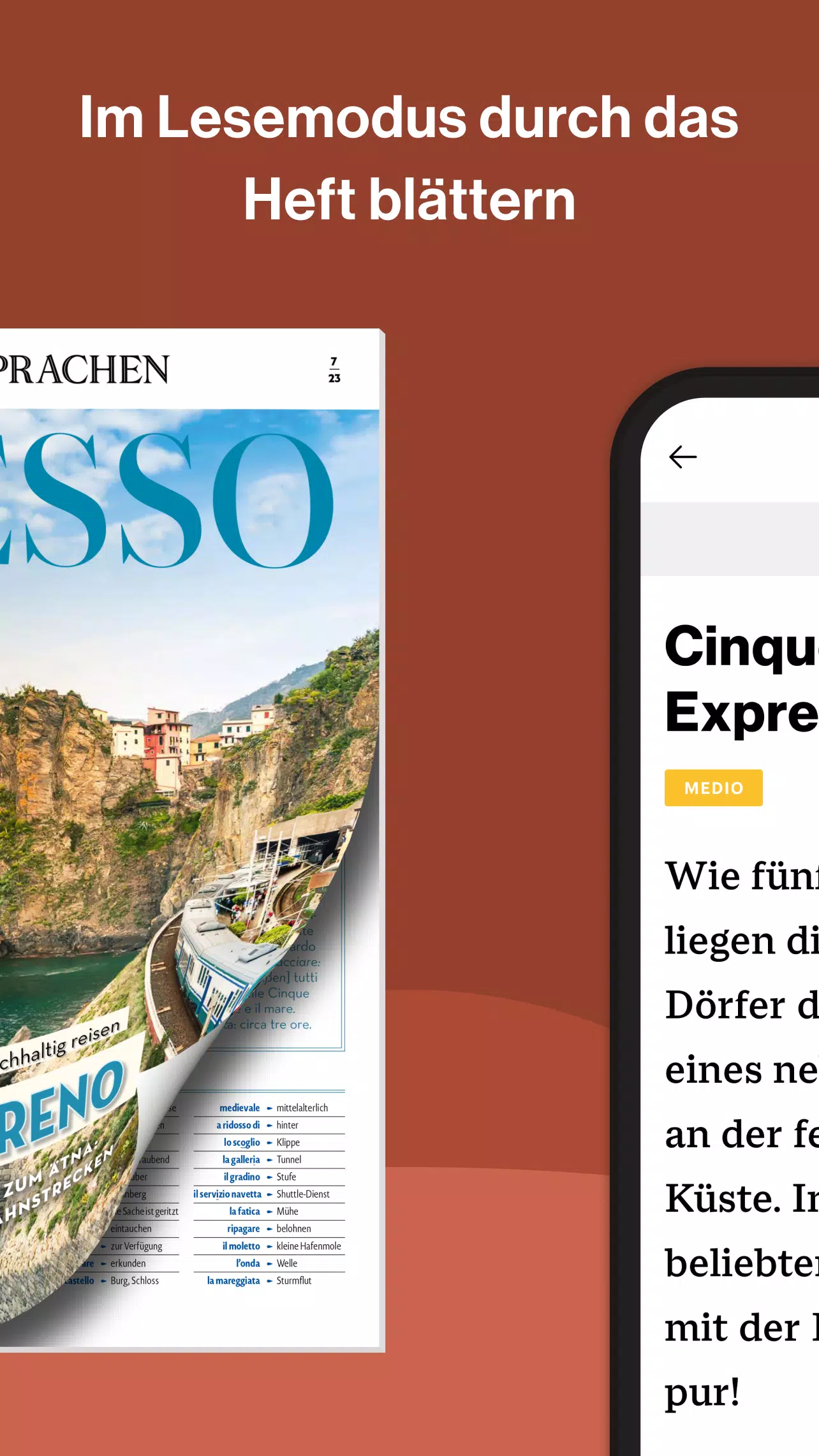 Sumérgete en el mundo vibrante de la lengua y la cultura italiana con nuestra emagazina. Cada número ofrece 70 páginas de contenido cautivador, con entrevistas, columnas e informes que arrojan luz sobre el estilo de vida italiano. Diseñado específicamente para alumnos de habla alemana, la revista ofrece ejercicios en tres niveles de dificultad: fácil (A2), medio (B1-B2) y difícil (C1-C2). Con solo un clic, puede acceder al contenido de audio que complementa el texto, mejorando su experiencia de aprendizaje.