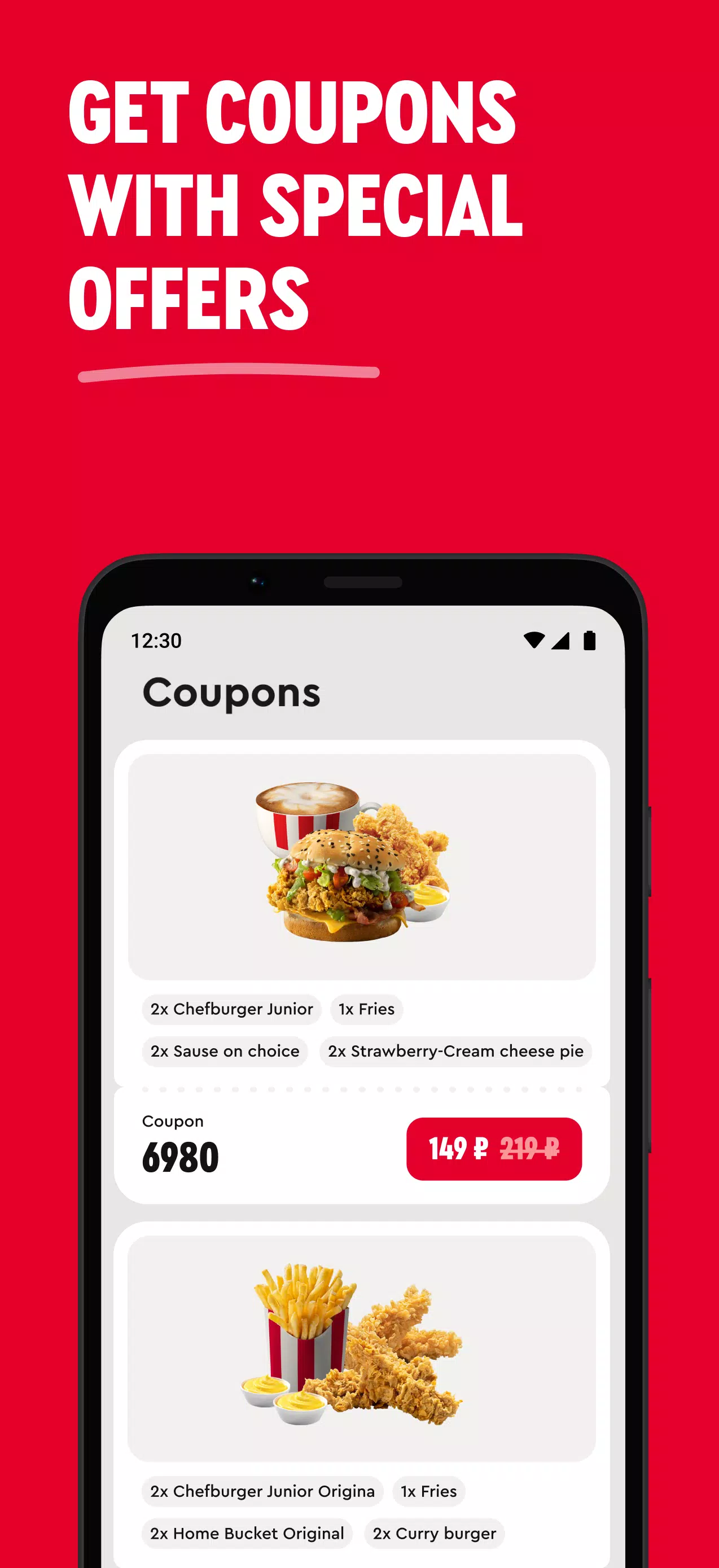 註冊並成為雞俱樂部的成員!通過應用程序下訂單,積累積分,然後將它們兌換為只有1盧布的菜餚。