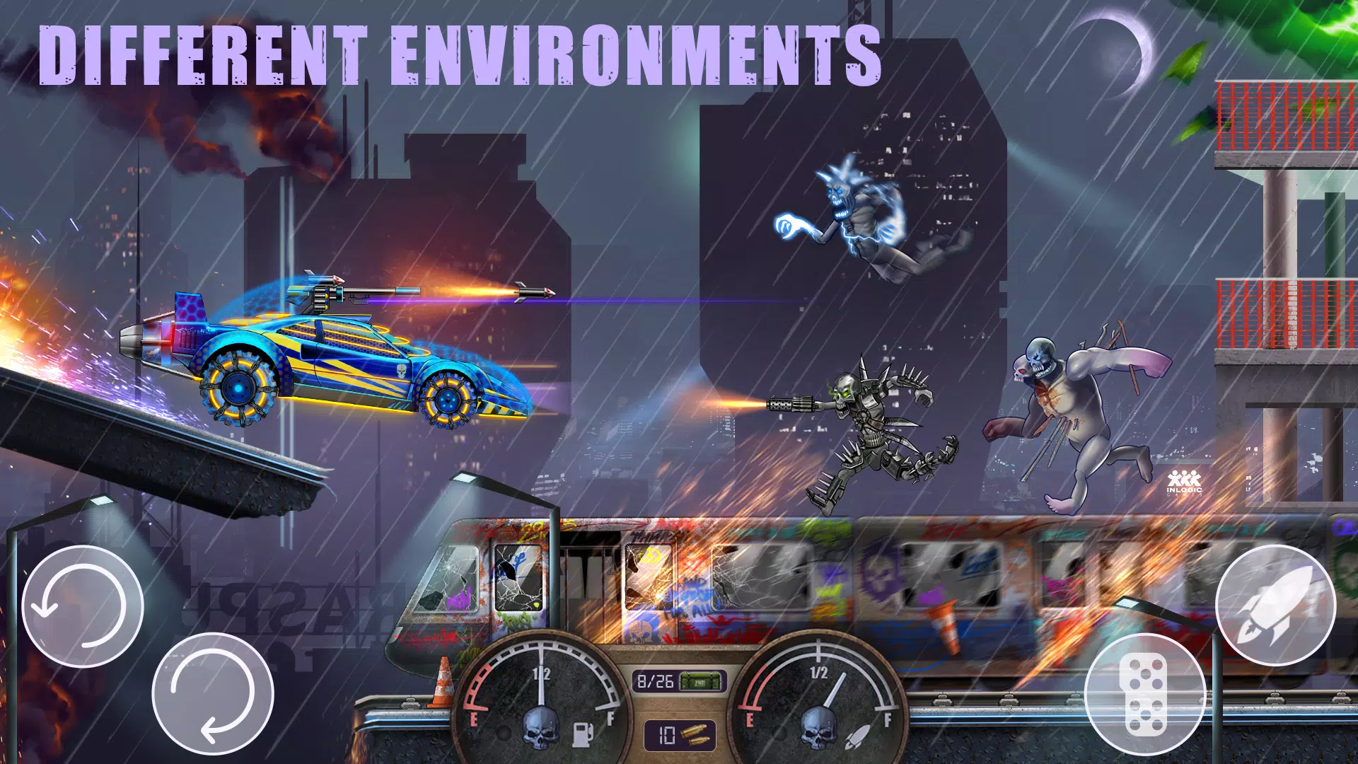 當您加速荒地時,請準備對抗成群的瘋狂殭屍。為了確保您的生存,請使用特殊武器,額外的燃料,硝基增壓,更強的車輪和其他動力來升級殭屍汽車。成為終極的憤怒公路戰士,掌握爬山的藝術,並使用槍支擊落殭屍,然後才能損壞您的車輛。